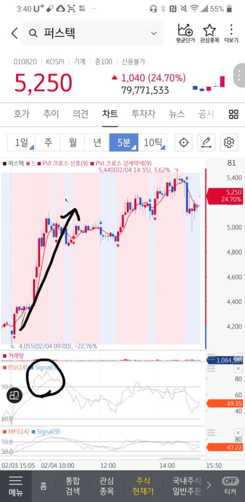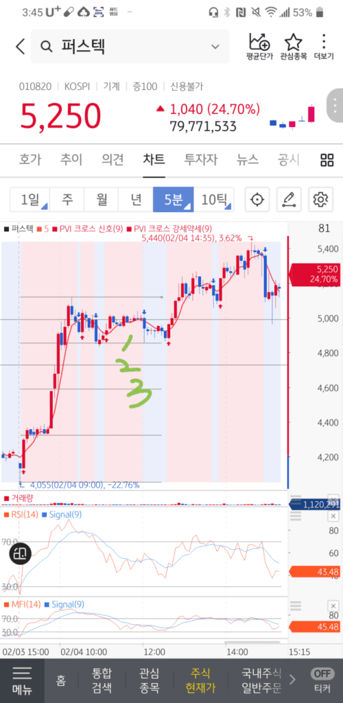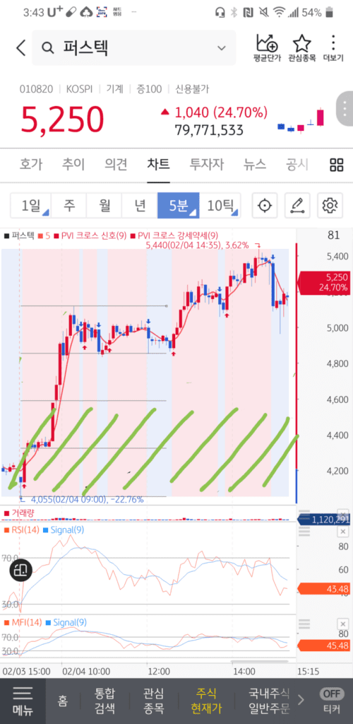 퍼스텍 5분봉 차트입니다.