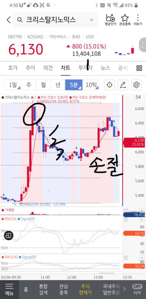크리스탈지노믹스 5분봉 차트입니다.