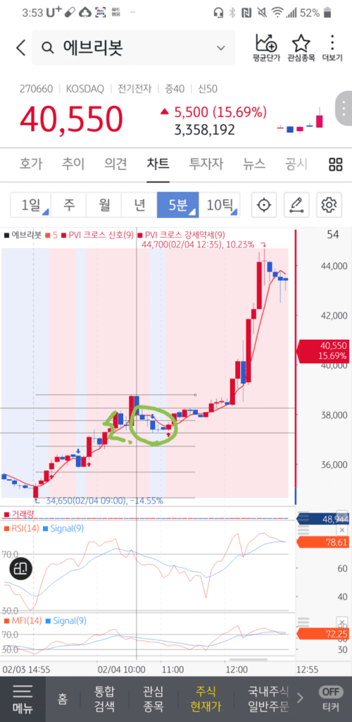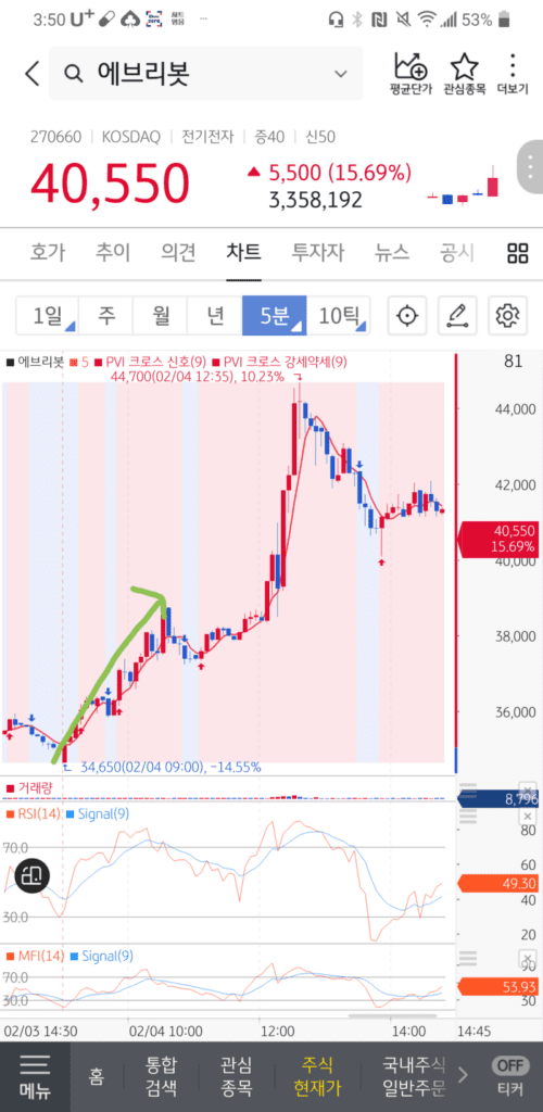 주식차트 에브리봇 5분봉 차트입니다.