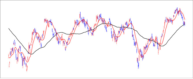 이동평균선은 위에 있는 그래프의 붉은선과 검은선을 가리키는 말입니다. 들쑥날쑥한 주가가 평균적으로 어떻게 움직였는지 조사를 한 것이 바로 이동평균선입니다.