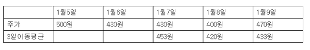 꿋꿋하게 계산을 하면 1월 7일의 3일이동 평균은 (500원 + 430원 + 430원)/3 = 453원이 되고, 1월 8일의 이동평균은 (430원 + 430원 + 400원)/3 = 420원, 1월 9일의 이동평균은 (430원 + 400원 + 470원)/3 = 433원이 됩니다.