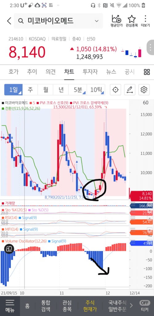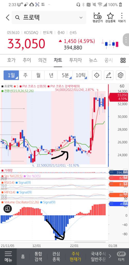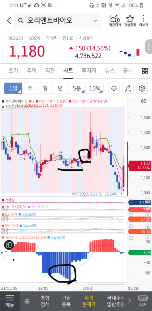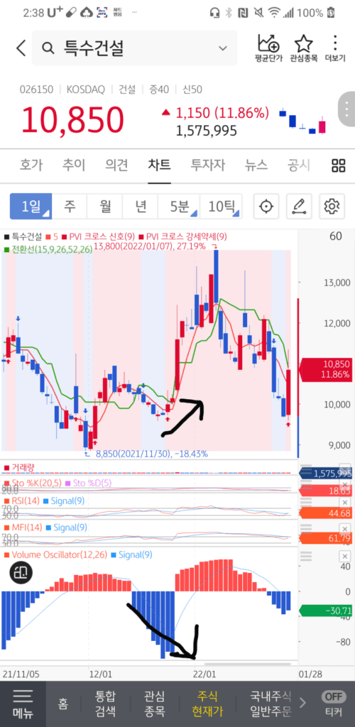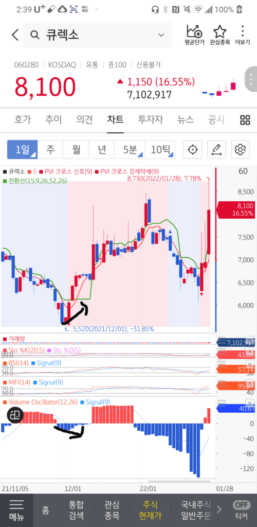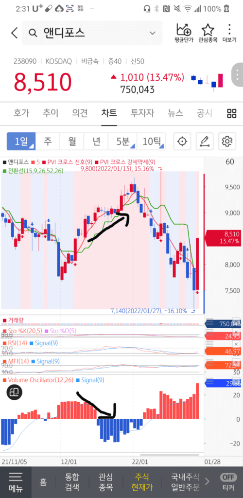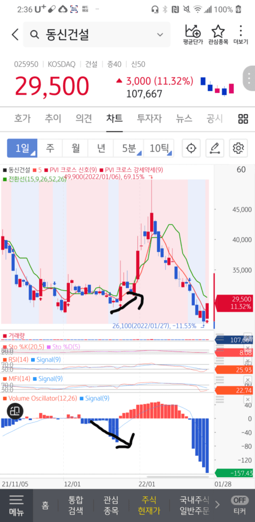 볼륨오실레이터가 음봉이 커질수록 주가도 같이 떨어져야 정상인데,오히려 주가는 천천히 상승중입니다.이때 전환선을 올라탈때 매수하시면 수익을 보실 수 있을 겁니다.