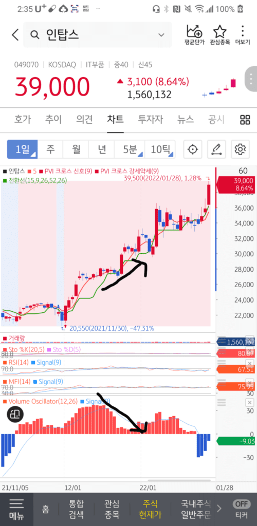 인탑스는 볼륨오실레이터가 양봉 구간이고 양봉이 작아지면서 주가도 눌려야 하는데 오히려 상승하죠.이후 추가 상승을 추측해 볼 수 있는 것입니다.