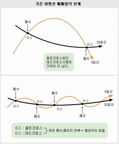 일반적으로 5일선이 20일선을 상향돌파할 때 골든크로스, 하향돌파할 때 데드크로스라 하죠. 하지만 현대의 증권시장에서 적상병과 흑삼병 출현이 매매포인트의 시그널로 삼기에는 적절하지 않듯이, 이평선의 교차를 확인하고 매매타이밍의 기준으로 접급하기에는 현대 주식시장의 변동성과 추세전환 속도는 너무나도 빨라요. 단순한 이평선 매매로 접근하는 순간 수익은 줄어들고, 손실은 확대되요.