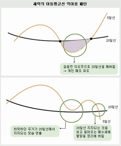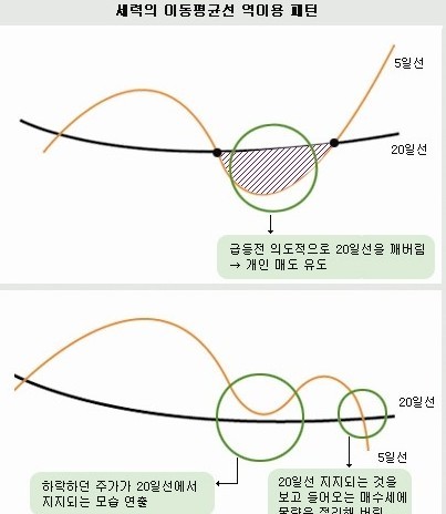 개인들이 골든크로스 발생이나 20일선이 지지되는 모습을 보고 매수하는 심리와 데드크로스가 발생되면 투매를 하는 주가심리를 역 이용해 세력들은 매집을 하거나 물량을 처분 하게 되는데, 이러한 세력의 의도에 말려 들어간 개인들은 이평선을 기준으로 매매했을 경우 “내가 사면 떨어지고 내가 팔면 오르는”매매를 경험하게 되는 것입니다.