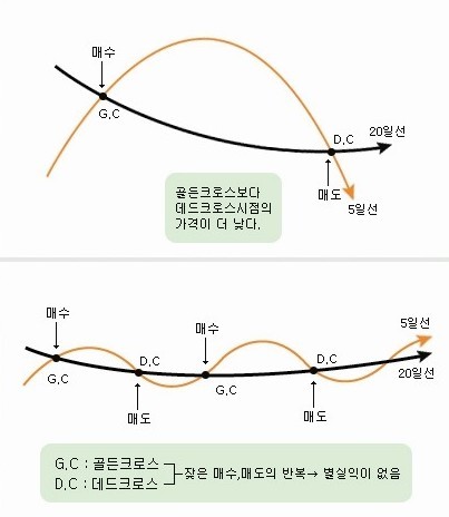 주가가 바닥에서 골든크로스를 시현했다면 추가상승 할수 있을 정도로 매수자 열기 후끈 달아올라 있는지, 또는 매도자가 매수자 누르고 이익실현 열중하고 있는지에 대한 분기점 역할을 하는 위치가 골든크로스의 영역이다. 골든크로스의 충돌을 견딘 종목의 주가는 더욱 상승하지만, 견디지 못하고 주저앉는다면 일시적인 주가하락을 예측할 수 있다.>