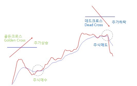 골든크로스라는 것은 단기주가이동평균선이 중장기주가이동평균선을 치고서 올라는 형태를 말하며 주가가 상승을 한다는 시그널로써 일반적으로 매수의 시점으로써 인식이 됩니다 그와 반대로 단기주가이동평균선이 중, 장기 주가이동평균선을 치고서 내려가는것을 바로 데드크로스라고 하며 주가의 하락과 매도의 시점의 시그널로써 받아들여집니다