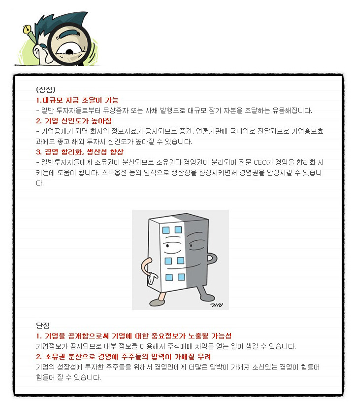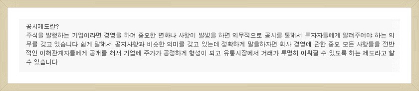회사가 상장을 한다면 자사주식에 투자판단에 중요한 영향을 미칠 수 있는 중요한 내용을 공시하도록 함으로써 투자자들에게 회사의 실체를 파악해서 투자결정을 할 수 있도록 기업내용 공시제도도 마련이 되었습니다. 이 제도의 기능은 바로 증권시장내에서 정보에 대한 불균형을 해소시켜서 증권거래의 공정을 더 높이고 투자자들을 보호하는 역할을 하는 것입니다. 왜냐하면 주식투자자는 회사의 경영자를 만나거나 혹은 경영에 직접 참여하기 어려워서 회사의 사정에 대해서 알지 못한다는 취약점을 갖고 있기 때문에 이런 공시제도가 생긴 것입니다.