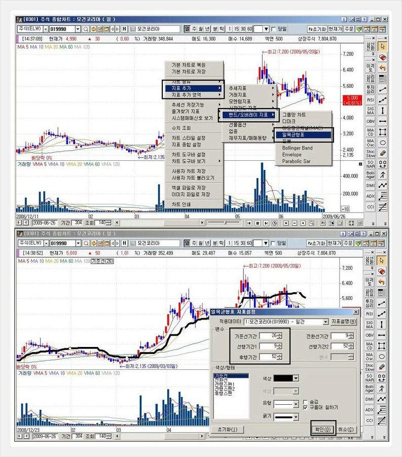 기준선매매기법 기준선이란 일목균형표에서 기준이 되는 선으로 시세의 방향성과 지지, 혹은 현재 시세에 따른 위치의 설정을 잡는 것에 대한 중심이 되는 선입니다. 당일을 포함해서 과거 26일간의 최고, 최저값을 평균으로 나타낸 것이며, 이 또한 이평선의 의미로도 해석할 수 있습니다. 기준선매매기법 이프렌드 상에서 설정방법을 자세히 소개해 드립니다. 먼저 챠트 창을 열어서 흰백에 마우스를 두고 오른쪽 마우스를 클릭하여 지표추가-> 밴드/오버레이 지표 -> 일목균형표를 클릭하게 되면 기준선이 생깁니다.