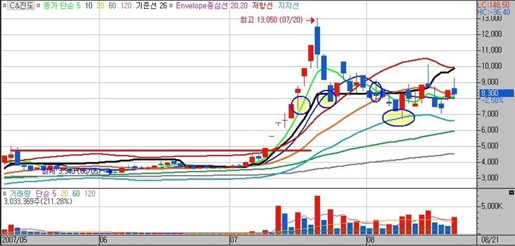 7월24일의 첫 10일선 8월2일의 첫 20일선, 8월8일의 첫 엔벨로프 하단선등