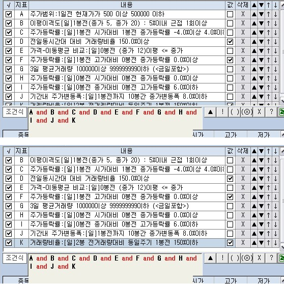 C부분은 전일 캔들의 몸통이 단봉의 음봉 또는 양봉으로 끝나는 것들을 검색하는 것이며