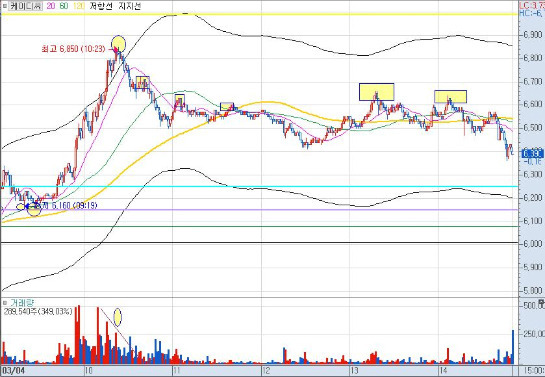 오늘 케이디씨는 09;00시에 최초로 6150원 저점을 찍었습니다…그리고 09;19분에 6160원..26분 27분에 또 6160원…