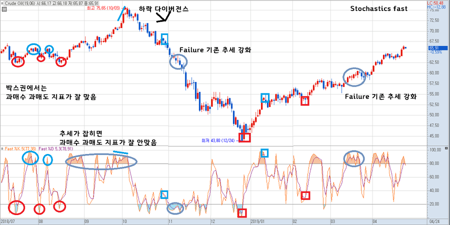 박스권에서 과매수 과매도 지표가 상당히 잘 맞는 편이고 추세장에 %K,%D의 교차가 유용하다.