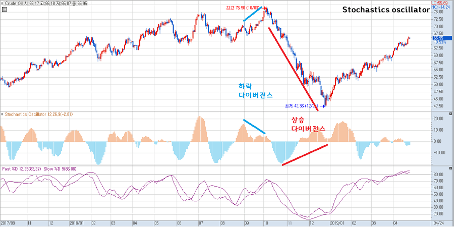 주가가 움직이는 특성을 가장 잘 반영한 지표로서 빠른 선인 %K, 느린선인 %D로 구성된다.
