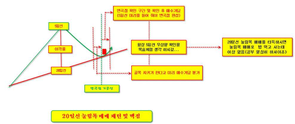 그래야만이 급락 위험성에서 벗어나게 되는데, 1차적으로 급매물과 이식매물을 받아주는 시점이 바로 20일선눌림목 시점이고, 이 시점을 공량하는 것이 20일선눌림목 매매법입니다.